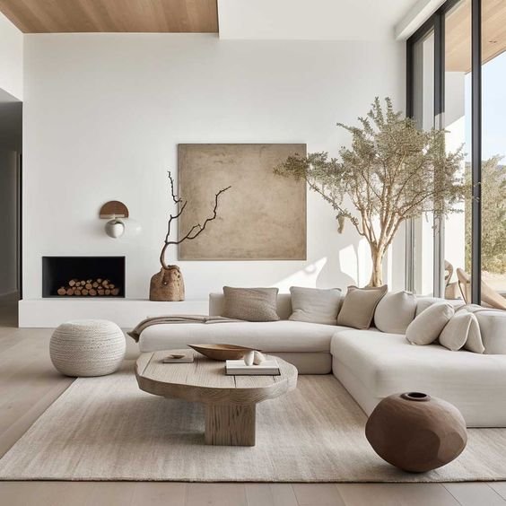 Anda juga bisa menambahkan meja kayu, beberapa vas, dan sebatang pohon untuk menambahkan kehangatan di ruang tamu tanpa membuatnya terlalu ramai.
